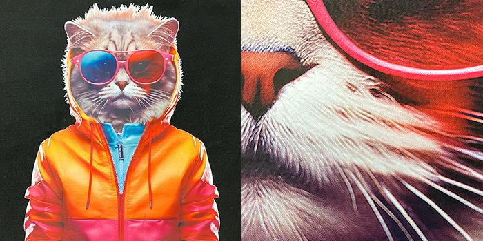 ●濃色・淡色、あらゆる素材に対応: 昇華プリントのように素材がポリエステルに限定されることなく、コットン、ポリエステル、デニム、キャンバス、ナイロンなど、ほぼすべての生地に対応。濃色・淡色を問わず、鮮やかな多色プリントが可能です。